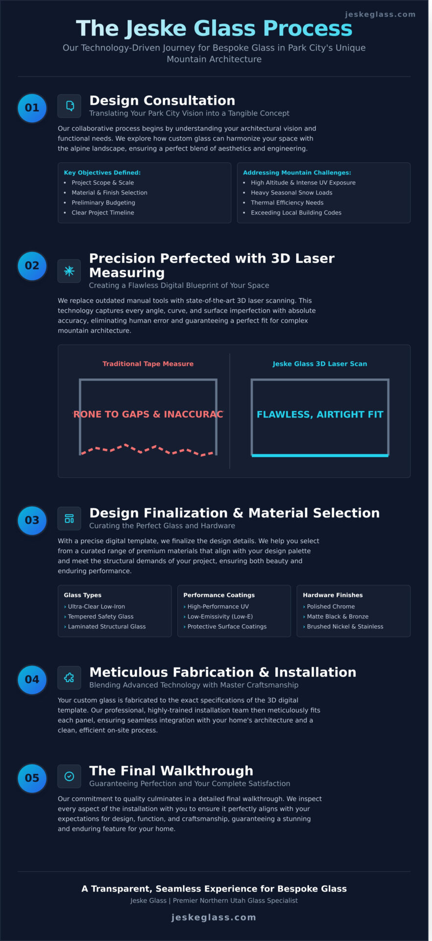 The Jeske Glass process is a testament to our unwavering commitment to architectural excellence. From the initial design consultation to the final walkthrough, we harmonize your unique vision with unparalleled craftsmanship. Our use of advanced 3D Laser Measuring technology ensures a flawless fit, while our collaborative approach guarantees that every detail is meticulously considered, transforming ambitious concepts into tangible elegance for your Park City home.